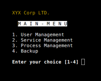 #!/bin/bash tput clear # clear the screen tput cup 3 15 # Move cursor to screen location X,Y (top left is 0,0) tput setaf 3 # Set a foreground colour using ANSI escape echo "XYX Corp LTD." tput sgr0 tput cup 5 17 tput rev # Set reverse video mode echo "M A I N - M E N U" tput sgr0 tput cup 7 15; echo "1. User Management" tput cup 8 15; echo "2. Service Management" tput cup 9 15; echo "3. Process Management" tput cup 10 15; echo "4. Backup" tput bold # Set bold mode tput cup 12 15 read -p "Enter your choice [1-4] " choice tput clear tput sgr0 tput rc